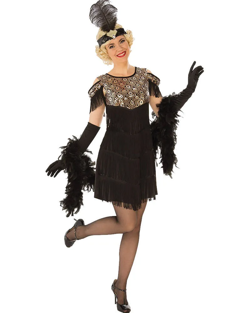 Time to dazzle! Get that speak-easy feeling when you dress in this fabulous tassled & sequined 1920s Black & Gold Flapper womens costume.