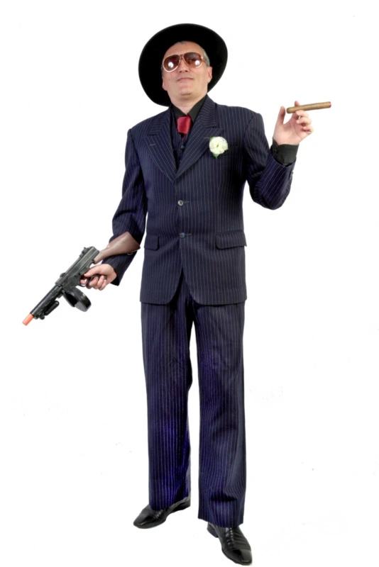 This quality 3 piece navy with white pin-stripe, double breasted gangster suit is the real deal – not flimsy, packet costume quality. Includes authentic felt fedora & quality silk fringed scarf & tie.