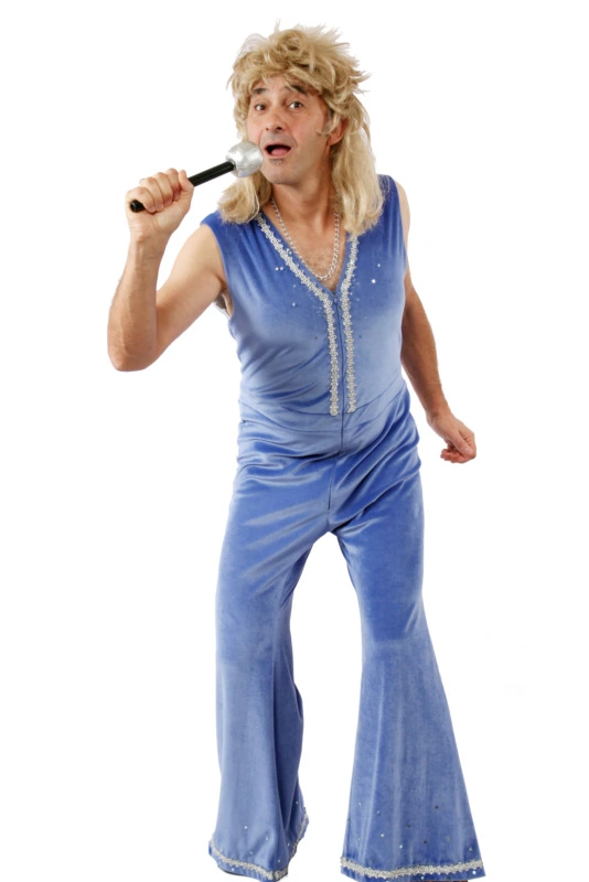 A handsewn, flared purple velvet jumpsuit with silver trim. Only a mullet wig can improve this classic ensemble.