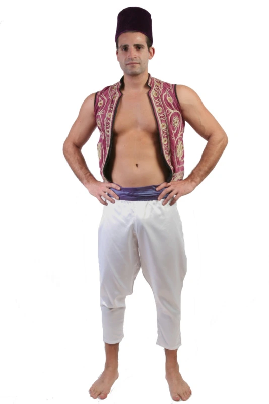- We have a wide variety of vests & pants instore, however the classic Disney Aladdin is typically portrayed with a purple fez hat, purplish vest, white pants & gold sash. We have 1 only of this complete look in XS. There are multiple other male genie costumes available in larger sizes: please see our range.