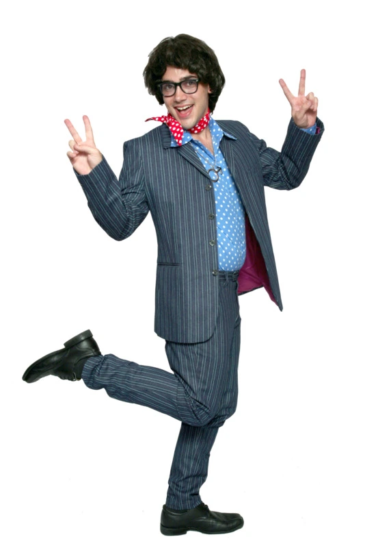 Be an international Man of Mystery slash Sex God in this groovy, Carnaby Street inspired, custom made suit. Available with red or blue polka dot shirt (to be teamed with a blue or red, mismatching cravat).