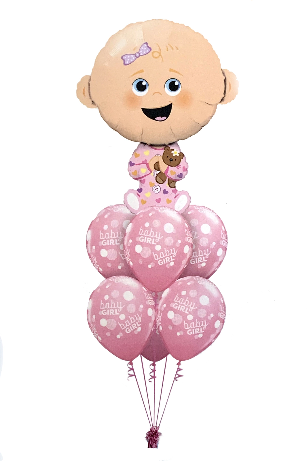 - Baby Girl Pink & Rose Dots-a-Round print latex balloons 2 x 3 – 28cm ea – also available in blue. Colours & prints can be customised.