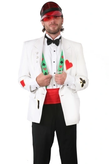 This dapper white jacket with strategically placed card suites & some clever accessories, have you ready to rule the roulette table in no time!