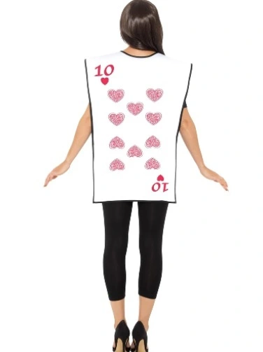 - Tabbard – one size, overhead, reversible tabbard which affixes with black ribbon at the sides. Printed on one side with the Ace of Spaces & on the other with the the 10 of Hearts.