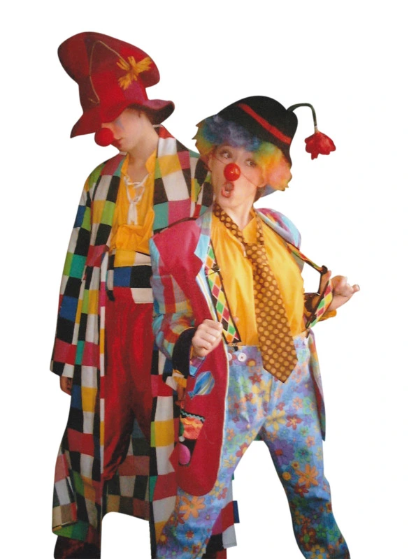 Slouchy top hats with wilting flowers; patchwork tailcoats; mixmatched, oversized pants & braces – mix & match options instore to suit the most discerning comic.