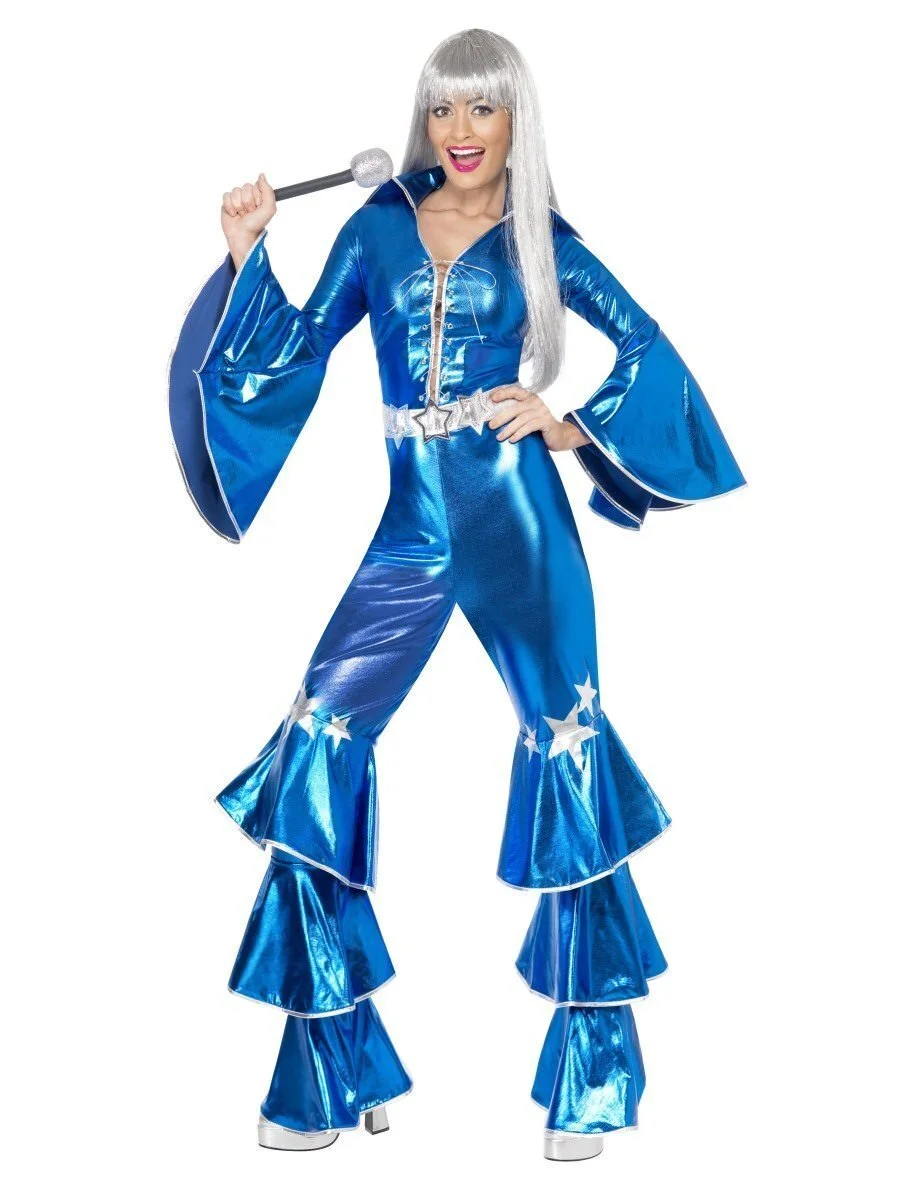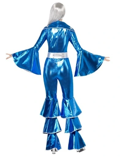 Hit the dancefloor in this dazzling disco blue front lace-up jumpsuit with all the trademark Abba-inspired trimmings, including batwing sleeves & flouncy layered trouser legs.