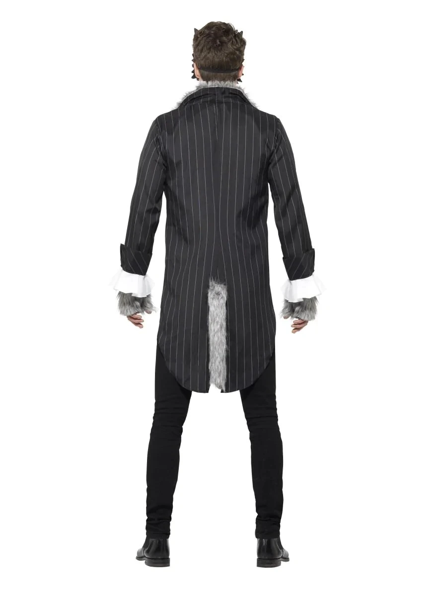 - Jacket – black pin-stripe tailcoat with attached mock vest, shirt & tie, plus faux fur trim