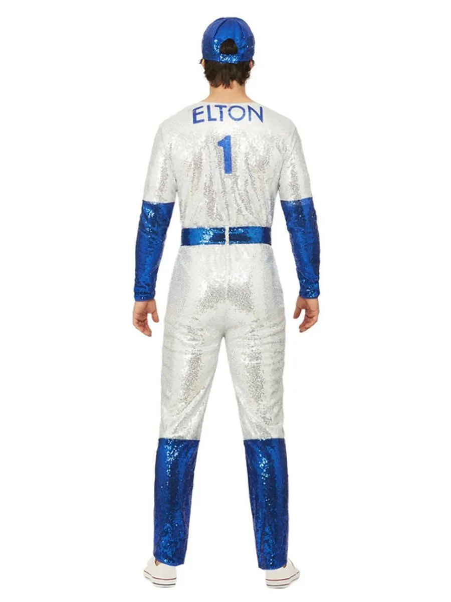 The bitch is back, baby! Salute Elton John in this fabulous sequin cap & L.A. Dodgers jumpsuit, modelled after the onstage costume he wore whilst performing sell out concerts at the famed Dodgers Stadium in 1975.