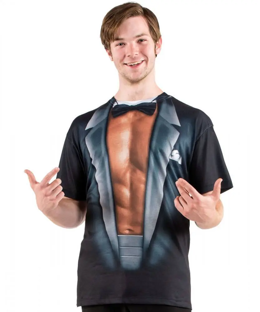 The Tuxedo Stripper Faux Real printed shirt. Ideal for any of the following scenarios: