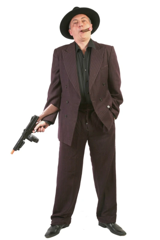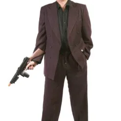This maroon with white pin-stripe, single breasted gangster suit is the real deal – not flimsy, packet costume quality. Includes authentic felt fedora & quality silk fringed scarf & tie.