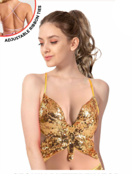 A stunning gold sequin top in the shape of a butterfly, with criss-cross fabric ties that weave across your back. Perfect summer festival fashion!