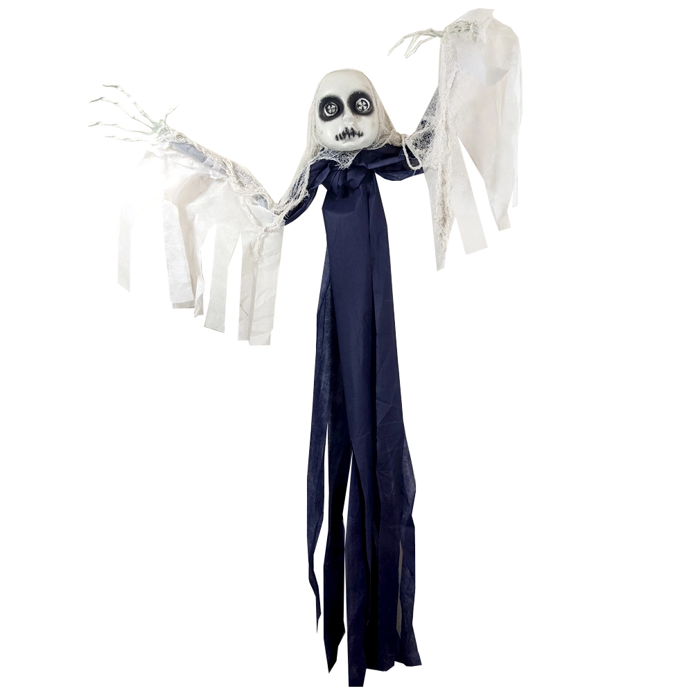A hanging ghoulish girl in navy dress with light-up eyes. Is she about to strangle you, or does she just want a cuddle? Come closer & find out…