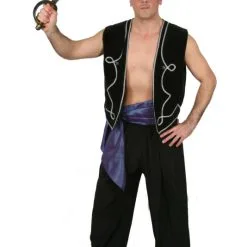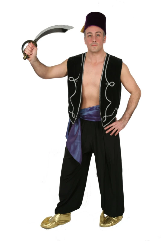 Our Arabian male genies are all mix & match. Team one of our handmade satin or velvet vests with ornate brocade &/or jewel trim, with a fez hat, black/white satin or black/red velvet billowy pants, a waist sash, earring & a sword… & you’re ready to jump onto the back of any magic carpet! A roomy pirate style shirt in black or white can be included to this look for the stated hire fee, if you’re thoughtful enough to not wish to intimidate other party-goers with your manly chest & bulging biceps.