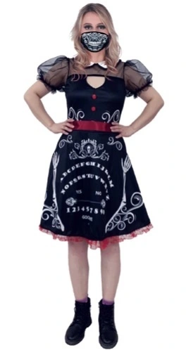Spookily cute, this retro tea dress features a ouija board print with matching skull mask, so you commune with the Other Side in a totally covid safe fashion…
