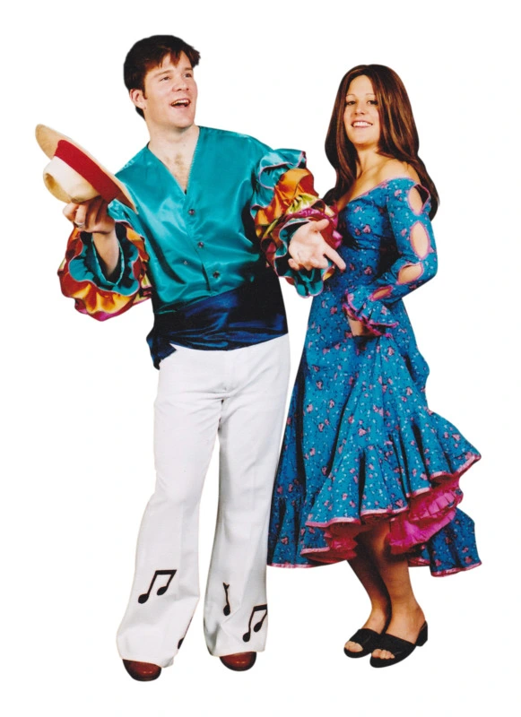 Let your baby take you straight to Rio in this handmade satin frill-shirt number! Hire shirts on their own for $35 or add white flares (a classic look!) plus accessories for the full price as listed. We have 4 x fabulous handmade, satin shirts – pink, orange, lime green & blue – there’s a hip little posse’ right there! Grab some Carmen Miranda dresses for your girls & party the night away!