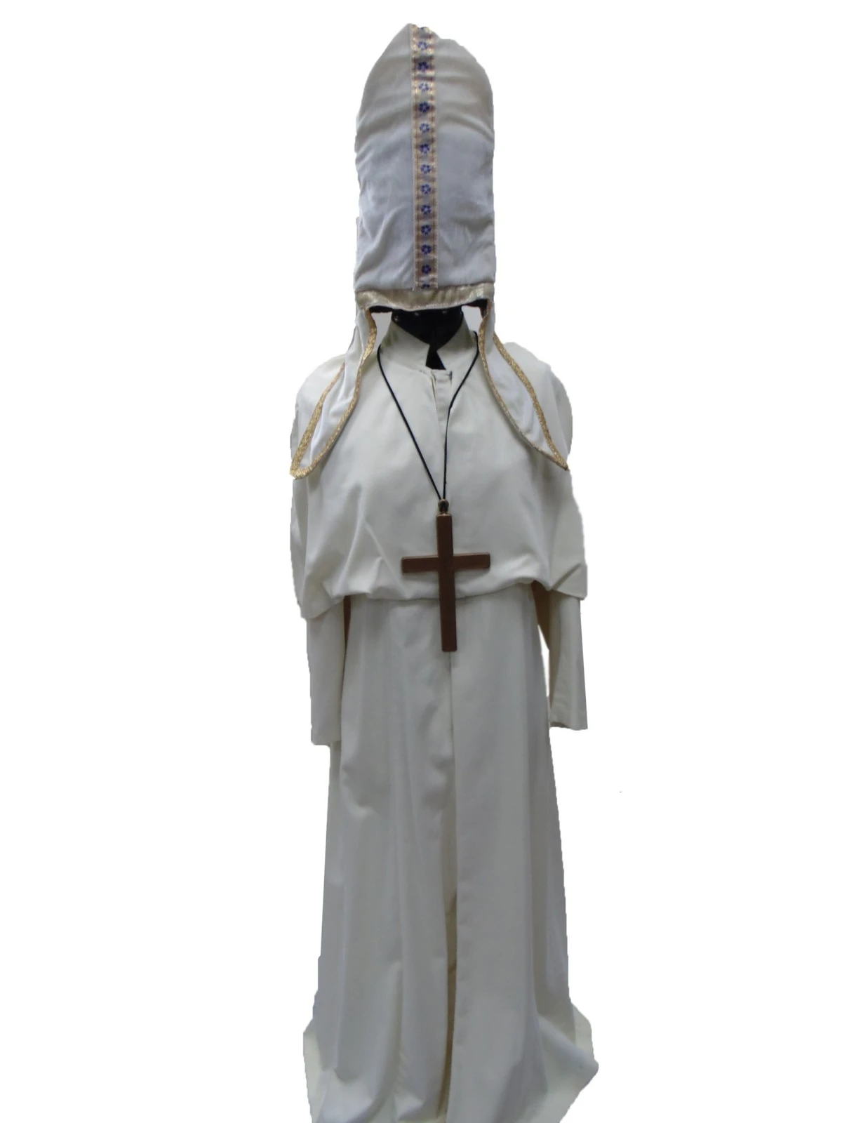 - Hat – mitre (tall, embroidered ceremonial hat) OR zucchetto (creme felt skull cap)
