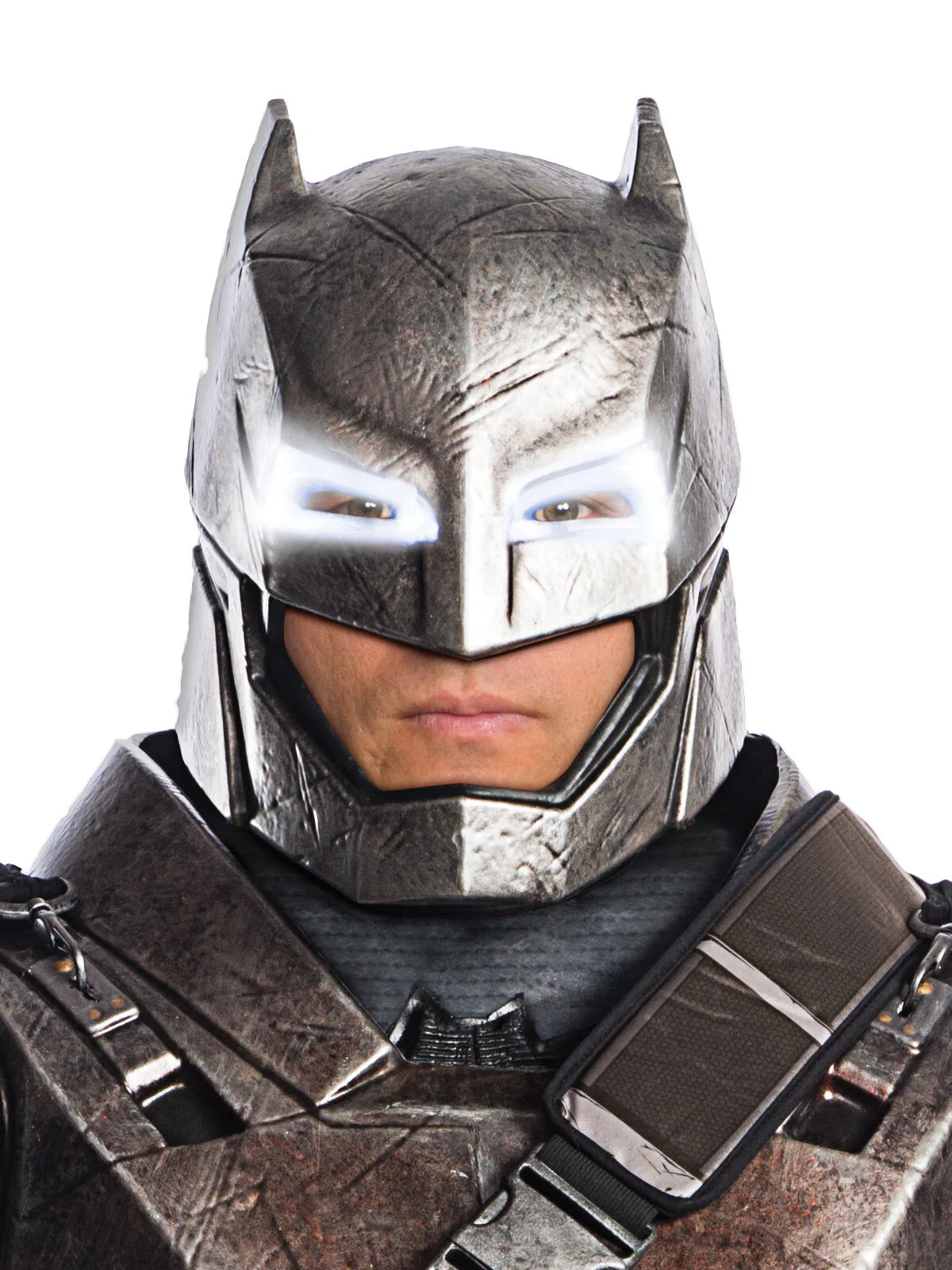 - Helmet – deluxe armoured Batman helmet with cut-out openings for eyes & mouth plus LED light-up feature around eyes – requires 4 x LR1130 batteries (not included