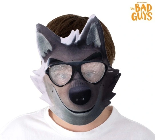 - A moulded plastic face mask of Mr Wolf from The Bad Guys, measuring approx. 26cm high x 25cm wide. Easy visibility through eyeholes, closes at rear with an elastric strap with velcro tabs.