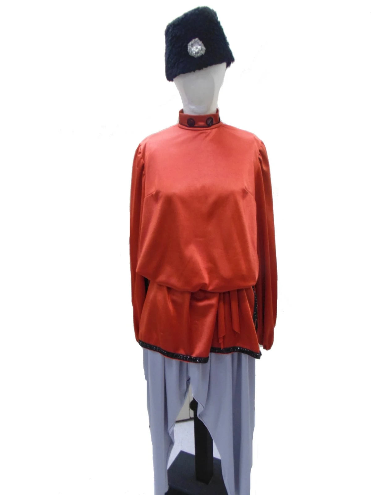 - Tunic – orange, high neck w/circular neck trim, black hem trim & orange waist tie