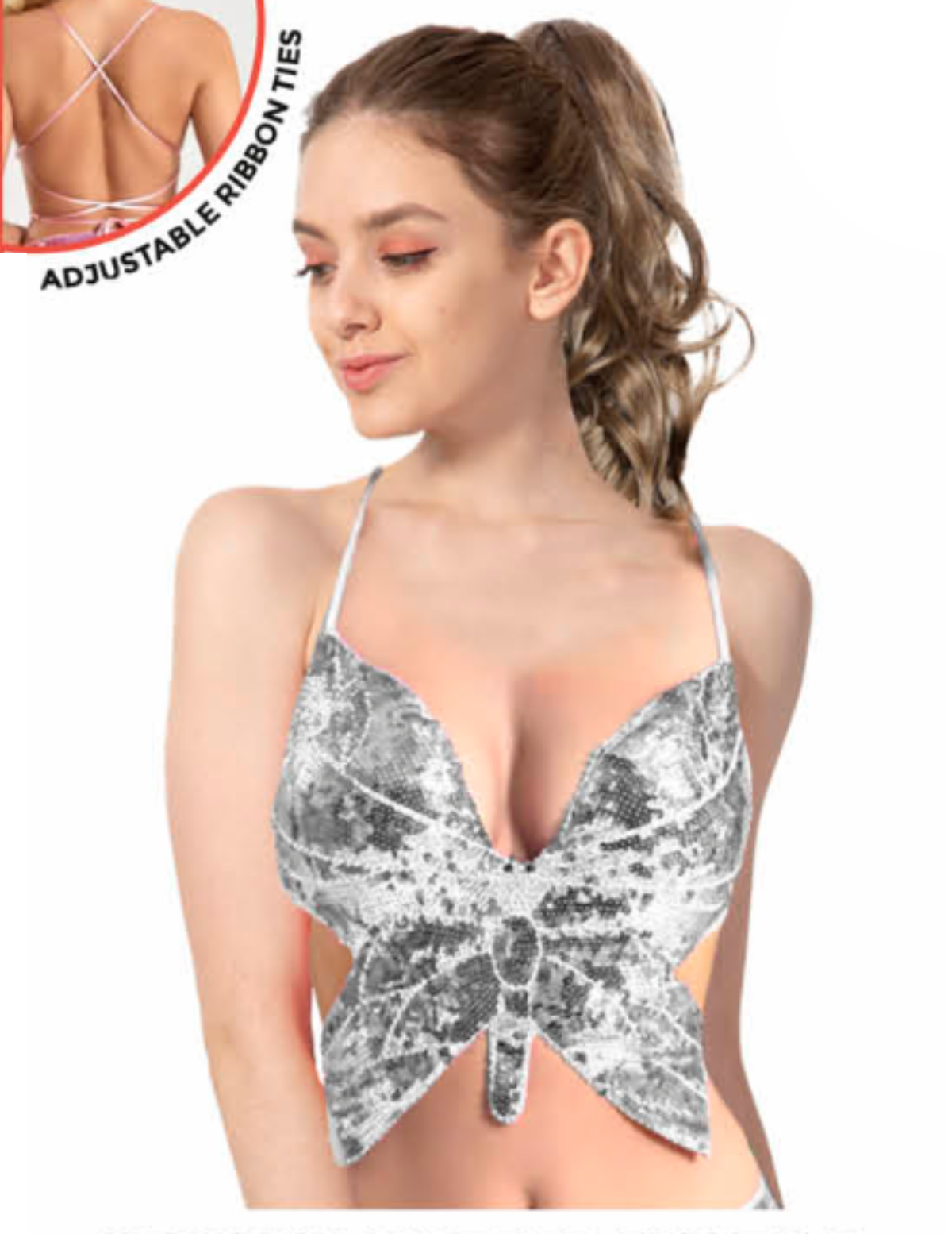 A stunning silver sequin top in the shape of a butterfly, with criss-cross fabric ties that weave across your back. Perfect summer festival fashion!
